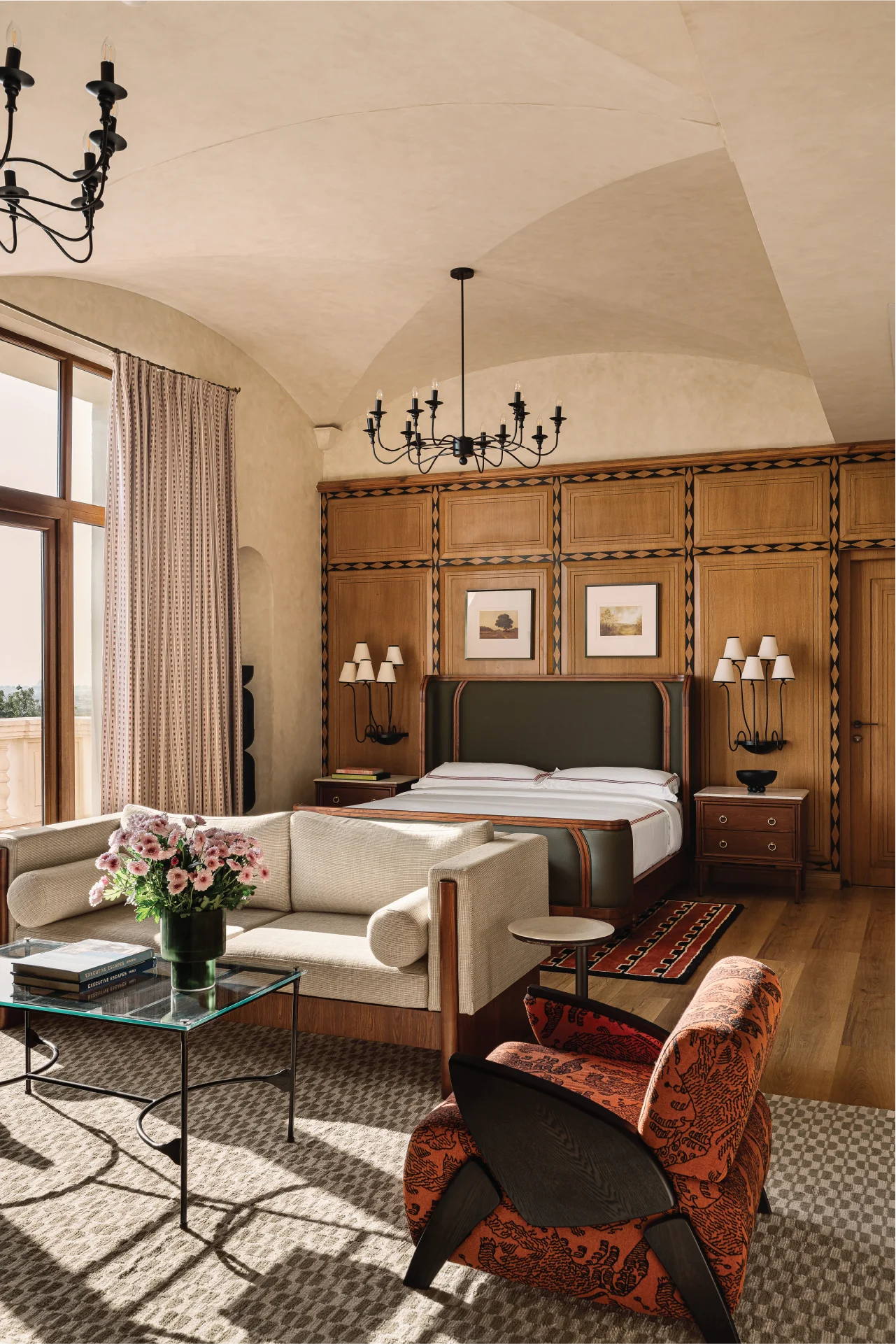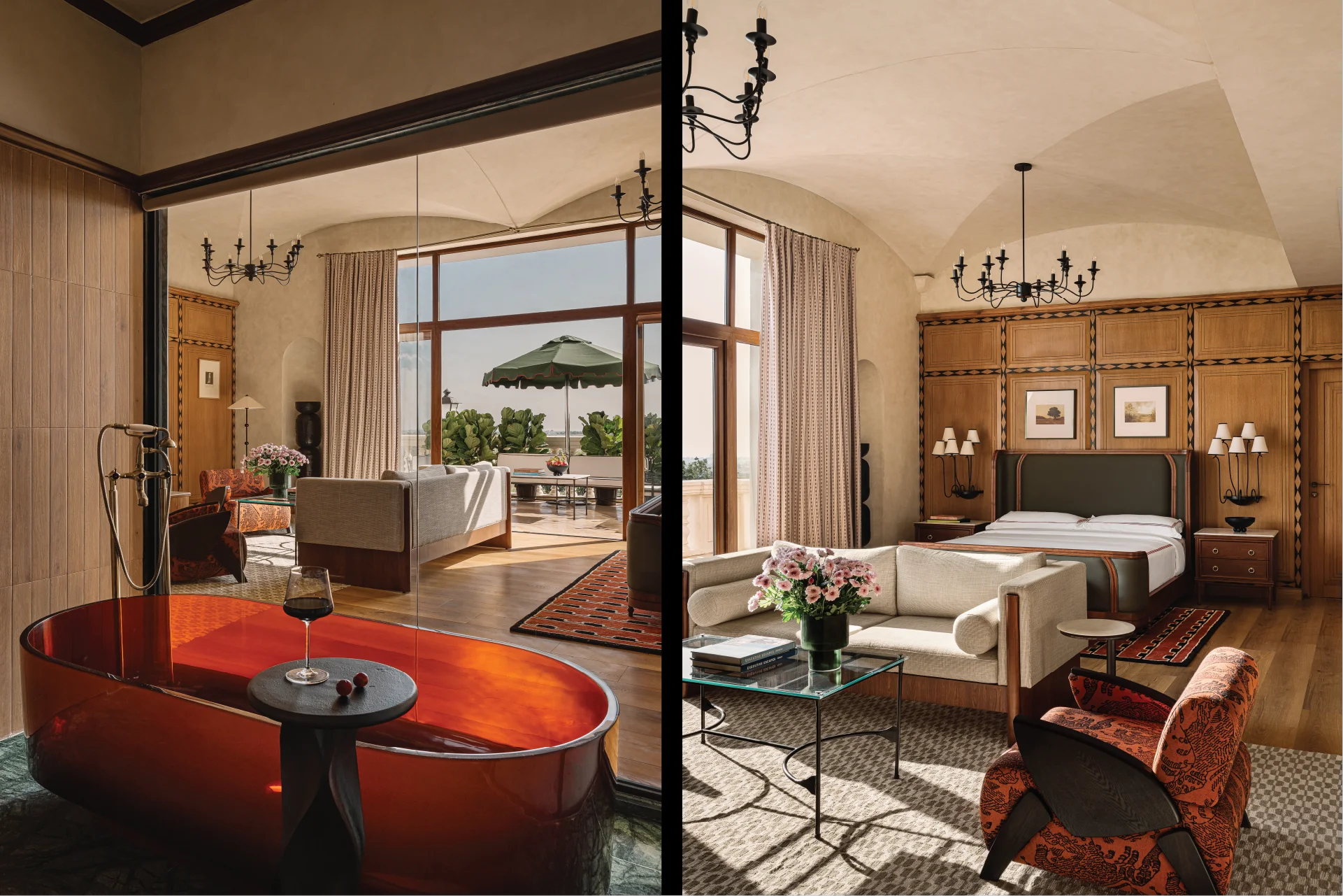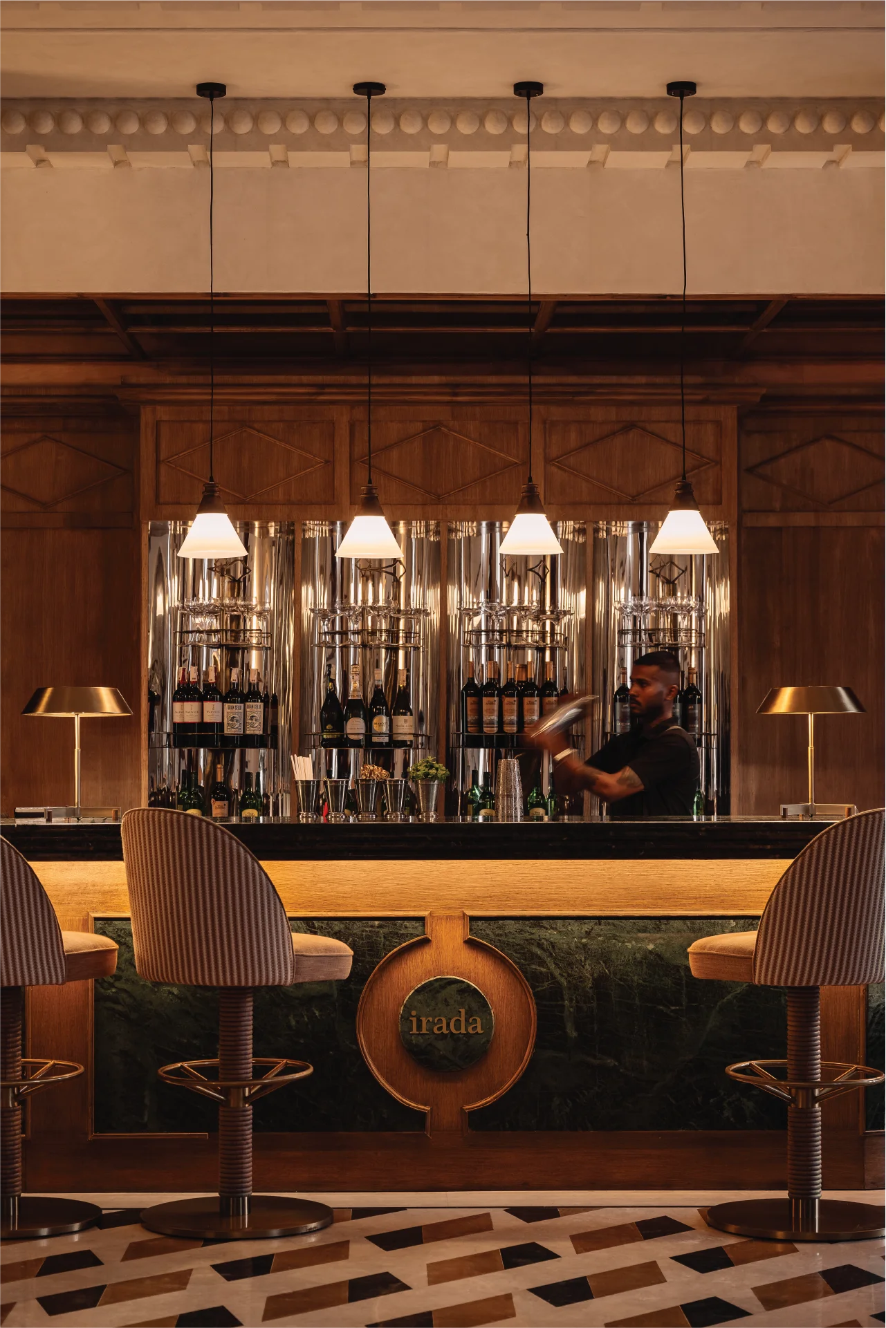 At the core of the project is the idea of intentional luxury, where every architectural and interior design decision supports a meaningful connection to context, heritage, and creativity. The boutique hotel design bridges historic architecture with a contemporary design language, combining neoclassical proportions with bold mid-century elements, bespoke furnishings, curated artworks, and locally sourced materials. Rooted in its landscape yet globally relevant, Irada represents a holistic design approach where architecture, interiors, and experience come together seamlessly.