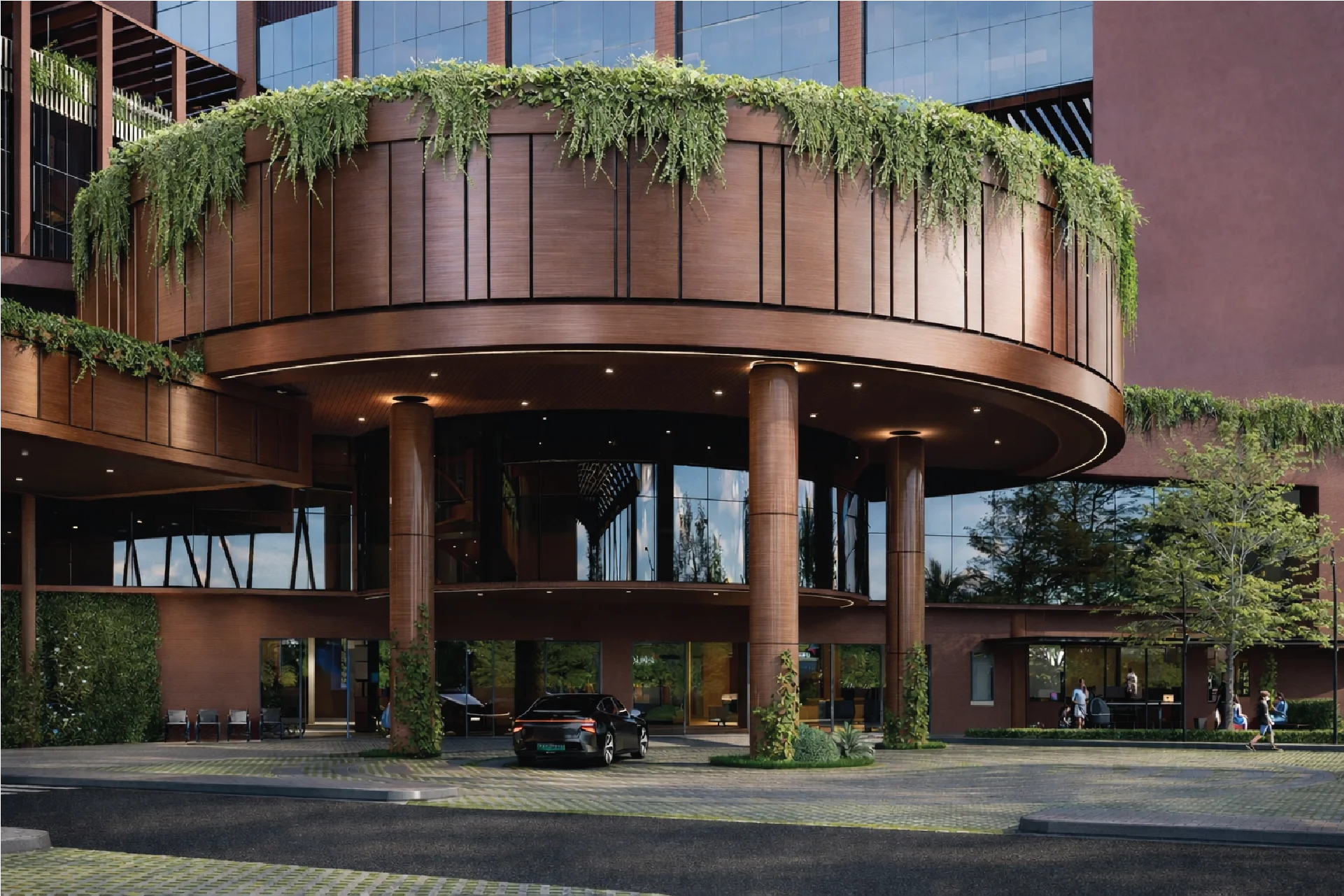 A mixed-use commercial hub organized around a central, landscaped forecourt. Warm materials, active ground floors, and layered façades create a lively urban destination